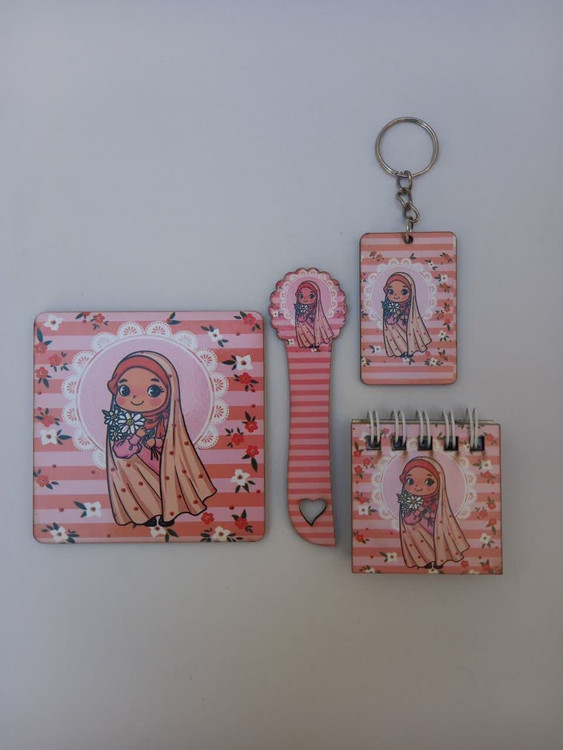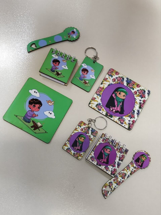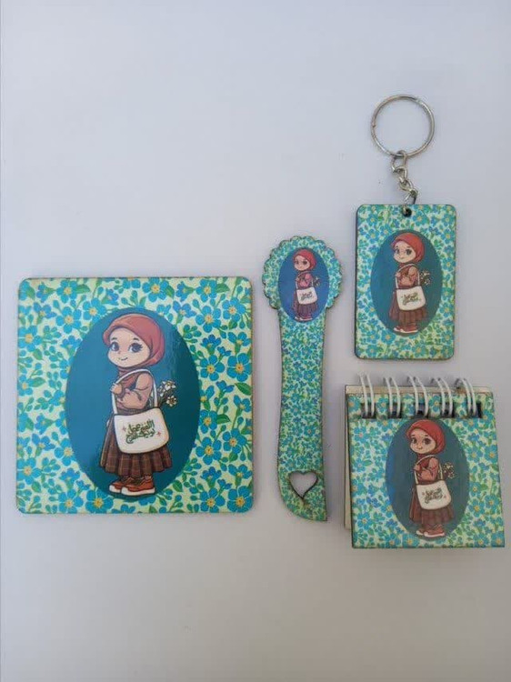 ست 4 تکه شامل زیراستکانی، جاکلیدی، دفترچه یادداشت و نشانگر قرآن و کتاب در طرح های مختلف کد 102 ( بسته های 20 تایی )